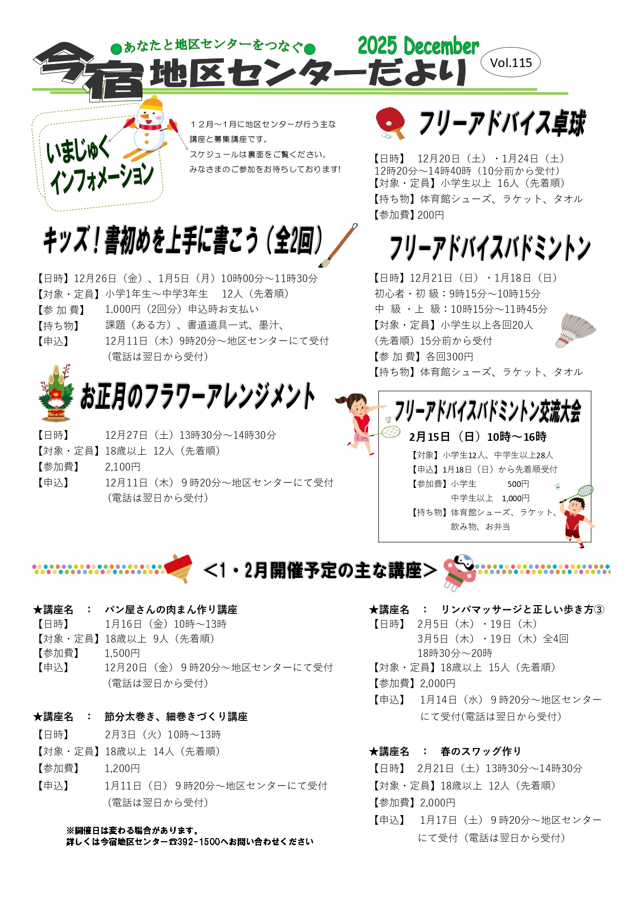 今宿地区センターとしては、2025~26年の年末年始は、「キッズ!書き初めを上手に書こう」「お正月のフラワーアレンジメント」が予定されているほか、月例企画として、卓球・バドミントンのフリーアドバイスやおはなし会も、継続して実施されています。