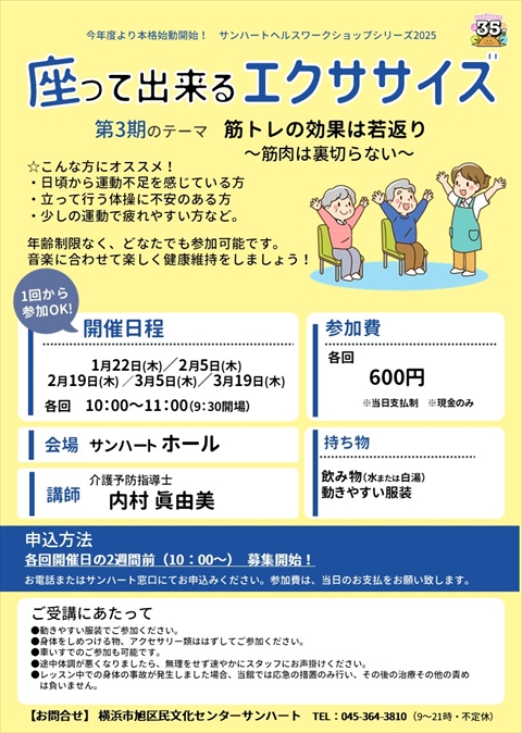 サンハートホールで、隔週木曜日の午前に「座ってできるエクササイズ」、同日午後に「シニア合唱部」が開催されます。