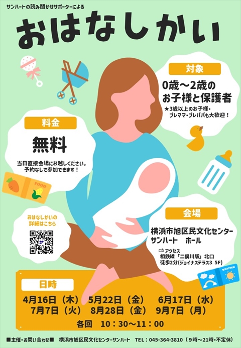 毎月開催されているサンハートの「よみきかせサポーター」による「おはなしかい」。2026年度前半の開催時間は、いずれも10:30~11:00。毎回、曜日を変えて開催します。